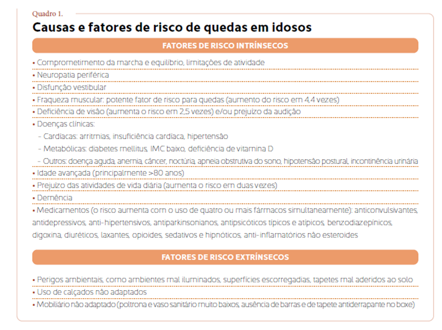Destaca-se que a história de quedas aumenta o risco de o indivíduo cair futuramente em duas a seis vezes. Além disso, a maioria dos casos que envolvem idosos tem causas precipitantes e predisponentes multifatoriais, bem como inter-relacionadas (quadro 1), algumas das quais modificáveis, devendo, portanto, ser conhecidas para possibilitar a adoção de medidas preventivas. Aproximadamente 60% das ocorrências são resultantes de múltiplos fatores.