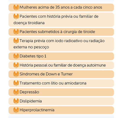 Segundo o Consenso Brasileiro da Sociedade Brasileira de Endocrinologia e Metabologia, a investigação de hipotiroidismo subclínico é recomendada quando há suspeita da condição ou como rastreamento em grupos específicos de indivíduos: