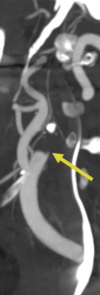 | Diagnóstico de oclusão verdadeira Na figura 2, o padrão reto, chamado de flat, tem especificidade de 100% para determinar a oclusão verdadeira5. Figura 2. Neste caso, há interrupção proximal e abrupta da ACI cervical logo após a emergência, o que é chamado de padrão flat, avaliado no plano sagital. |