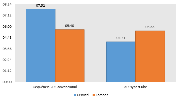 Figura 1. Comparação do tempo de aquisição da coluna cervical e lombar com sequências convencionais 2D versus 3D HyperCube em RM de 1,5 T. Sequências volumétricas apresentam menor tempo de aquisição.