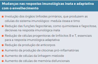 A imunossenescência corresponde às diversas mudanças no sistema imunológico que ocorrem com o envelheci - mento, que culminam com a redução das respostas imunológicas inata e adaptativa e com um incremento do estado pró-inflamatório.